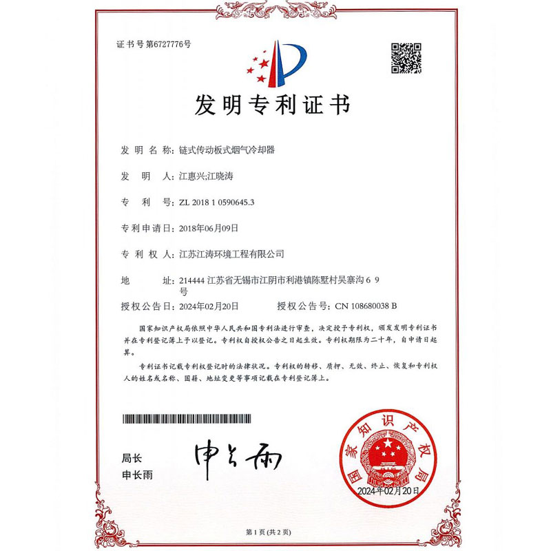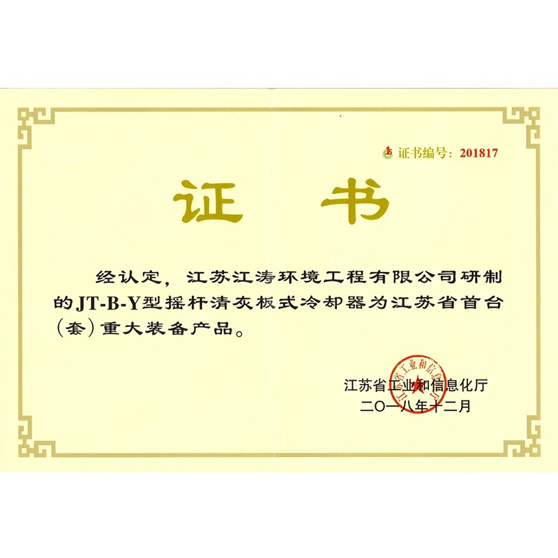JT-B-Y型摇杆清灰板式冷却器首台套重大装备产品证书