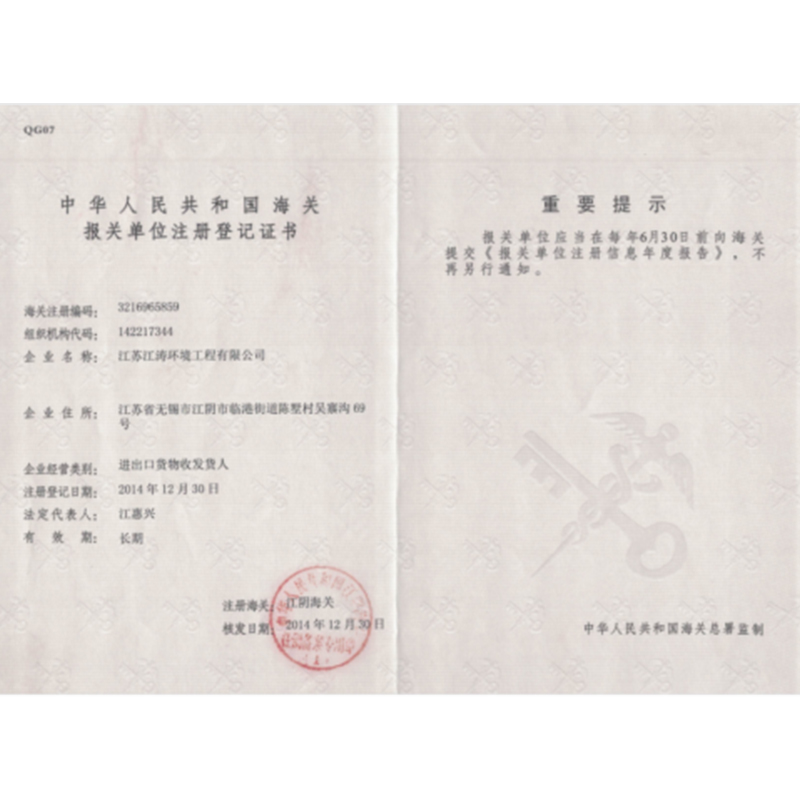 中华人民共和国海关报关单位注册登记证书